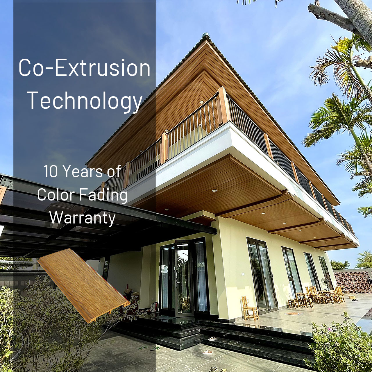 PVC-based material is extruded together with an ultra UV Armor layer, which will make the series of products still look fresh after a long period of time after installation. 15 years of color fading warranty is provided to co-extrusion WPC exterior wall panels, WPC decking, and WPC exterior timber tubes.